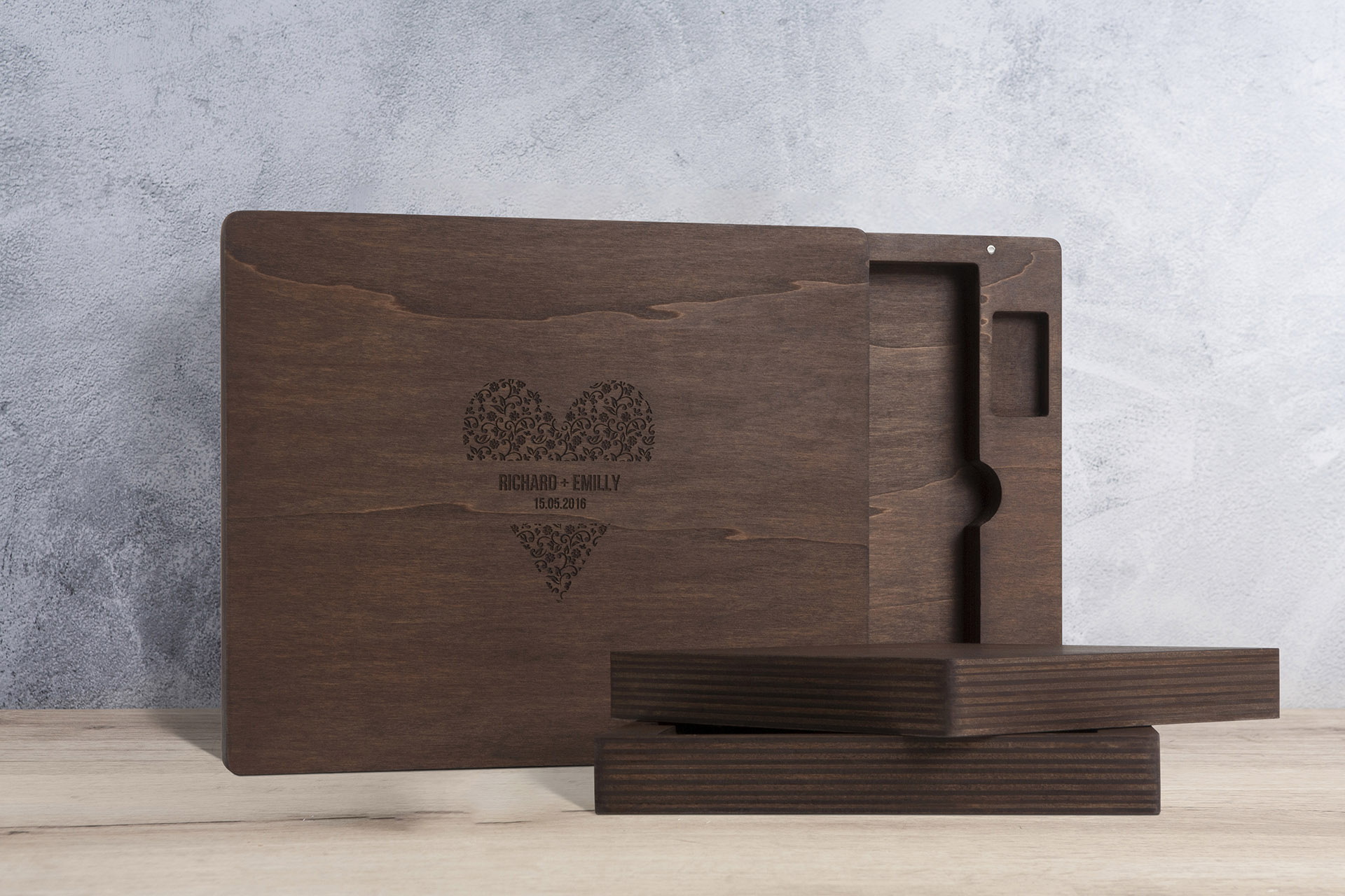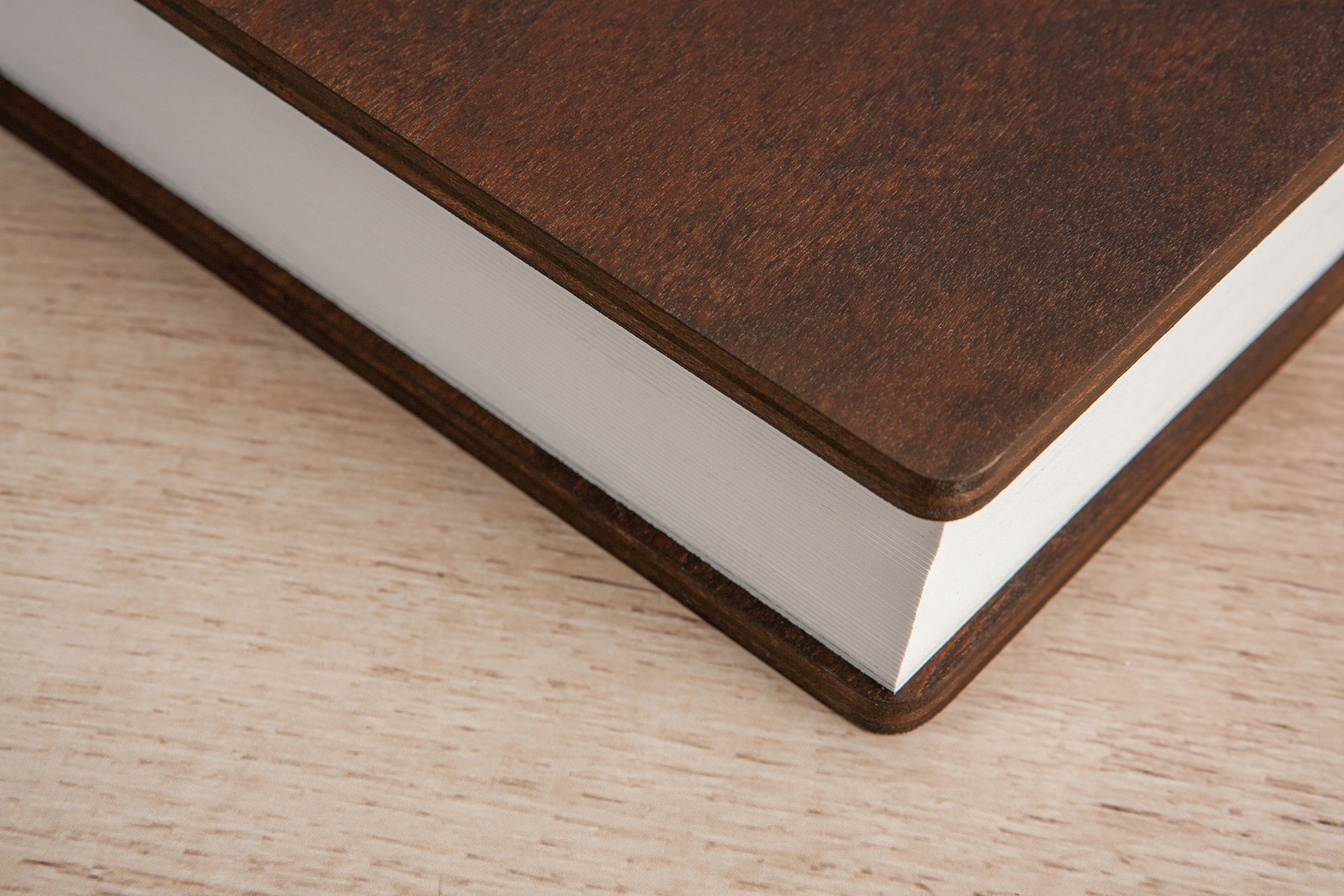 La couverture et le coffret sont en bois, tous deux ornés d’une gravure au laser (gravure identique sur la couverture de l’album et le coffret. Une finition au vernis est possible en option).